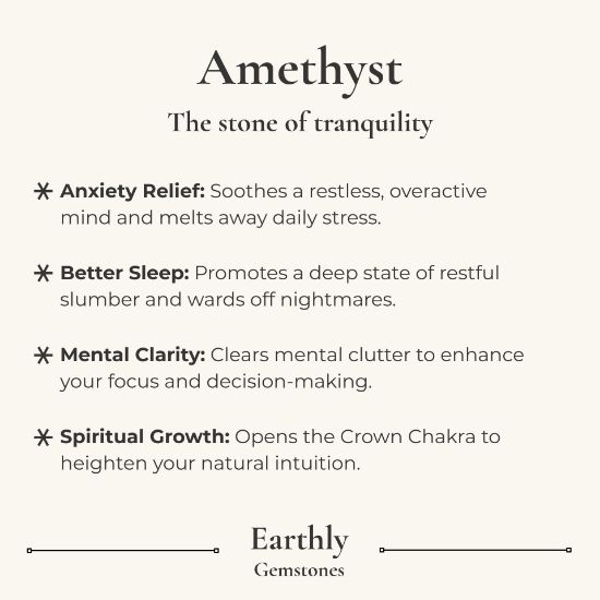 Deeply connected to the Crown and Third Eye chakras, Amethyst is a master healer for the mind and spirit. It is traditionally used to quiet racing thoughts, dissolve chronic stress, and create a protective energetic shield against surrounding negativity. Whether you are navigating a high-pressure workday, settling into a meditation practice, or struggling with restless nights, Amethyst works to clear mental clutter and restore a profound sense of inner calm. To learn more about Amethyst and it's metaphysical properties, check out our blog post: Amethyst Crystal Meaning: Healing Properties & Everyday Uses