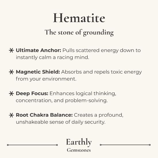 Strongly connected to the Root chakra, Hematite is the go-to stone for mental focus, logical thinking, and energetic grounding. Unlike softer grounding stones, Hematite works with a distinct directness, cutting through confusion, dissolving overthinking, and pulling awareness back into the body and the present moment with notable speed. It is traditionally used to strengthen willpower and self-discipline, improve concentration and memory retention, and build the kind of steady, unshakeable inner resilience that allows you to move through challenges without being destabilised. Hematite is particularly valued by students, professionals, and anyone who needs sustained mental clarity under pressure. It is also widely regarded as a powerful protective stone, absorbing and neutralising negative energy from the environment before it can take hold. To explore more Hematite pieces, visit our Hematite Crystals collection.
