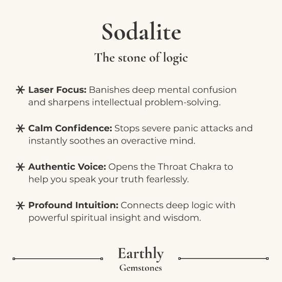 Sodalite is a beautiful blue mineral that is known for its calming and soothing energy and is believed to help with communication, self-expression, and creativity. Sodalite is also said to promote inner peace and help with mental clarity and focus. It is often used during meditation or as a tool for spiritual growth.
