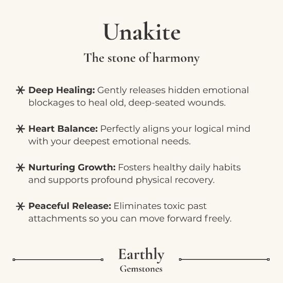 Unakite is a type of igneous rock composed of pink orthoclase feldspar, green epidote, and quartz. Unakite is believed to have a grounding and calming effect on the body, helping to alleviate stress and anxiety. It is also thought to promote emotional balance and improve self-esteem, making it a popular choice for spiritual and healing practices.